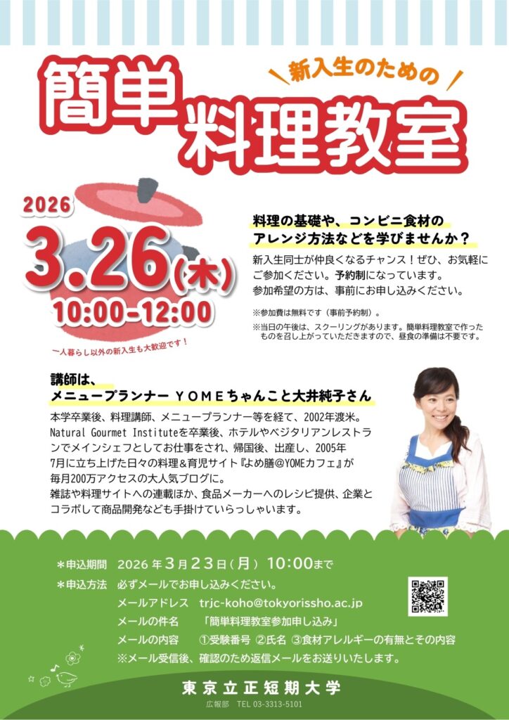 ※ 3月26日の午後はスクーリングが実施されます。簡単料理教室で作った料理を昼食とするので、昼食を用意してくる必要はありません。